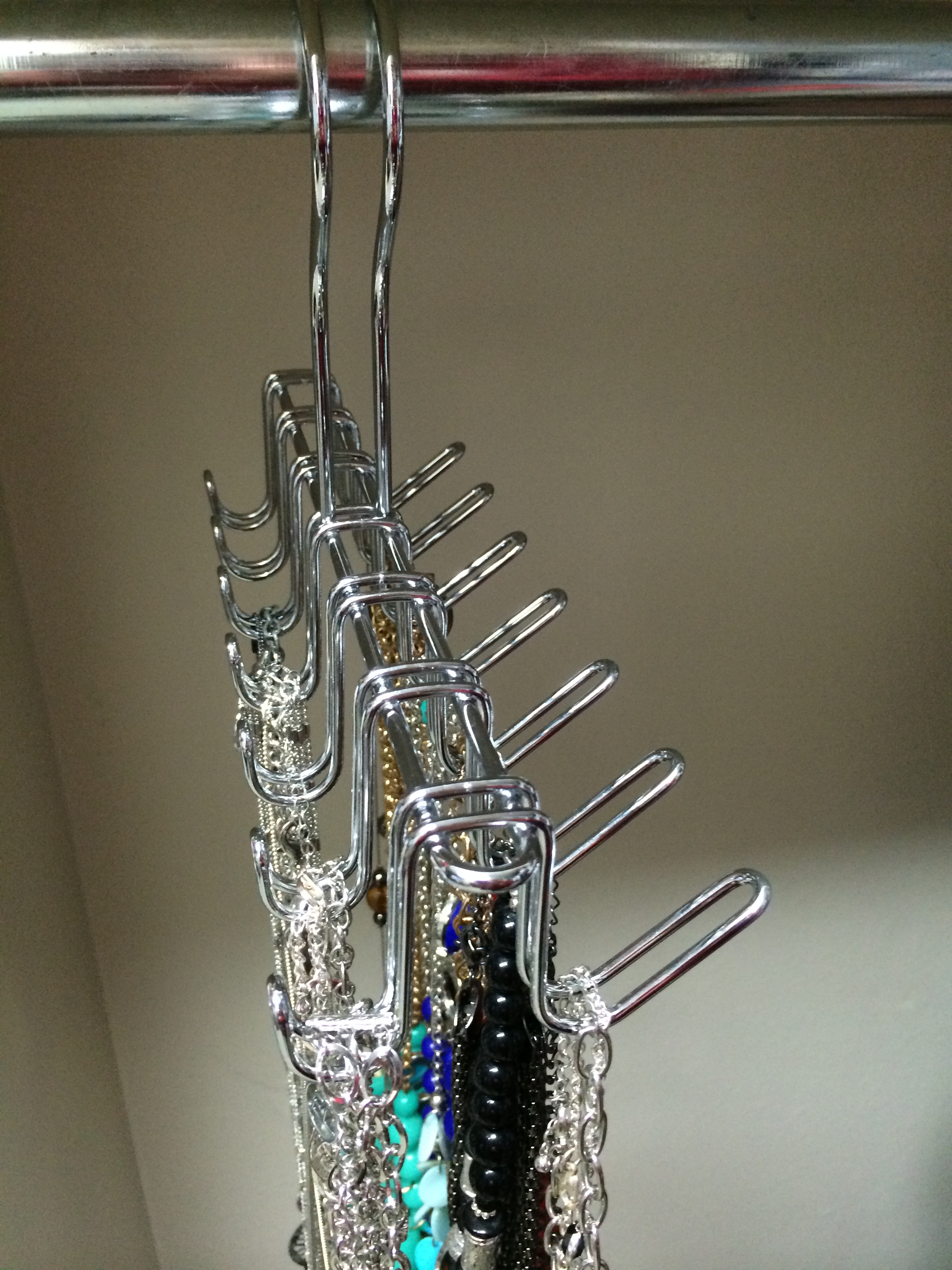 I’ll give you an example of how I used this step myself recently. I have always kept all my necklaces on one large hoop that hung on a single hanger in my closet. It did the trick to keep my necklaces untangled most of the time but it was hard to see them all and I ended up forgetting about most of the ones towards the back because they stayed covered up. So, I decided that I wanted to reorganize my necklaces. First, I laid themout by design and color to see what I was looking at as far as number of hooks, etc. Then, I got on Pinterest and started investigating how to go about making something of my own. There were some great ideas, but the issue for me was that I wasn’t looking for a whole lot of frills, I just needs something simple to hang my necklaces on that didn’t take up much space and didn’t take a lot of time or money to make. Then, I decided to look at Amazon to see what they had. After a few word searches, I came upon this belt and tie hook for $7.99. It’s exactly what I had in my head and it was cheaper than any of the supplies I was going to have to purchase for the projects I had just spent 30 minutes looking at on Pinterest. It’s working beautifully to keep my necklaces organized by color and design and I spent less than 30 minutes unpacking it, sorting necklaces, and hanging them up!