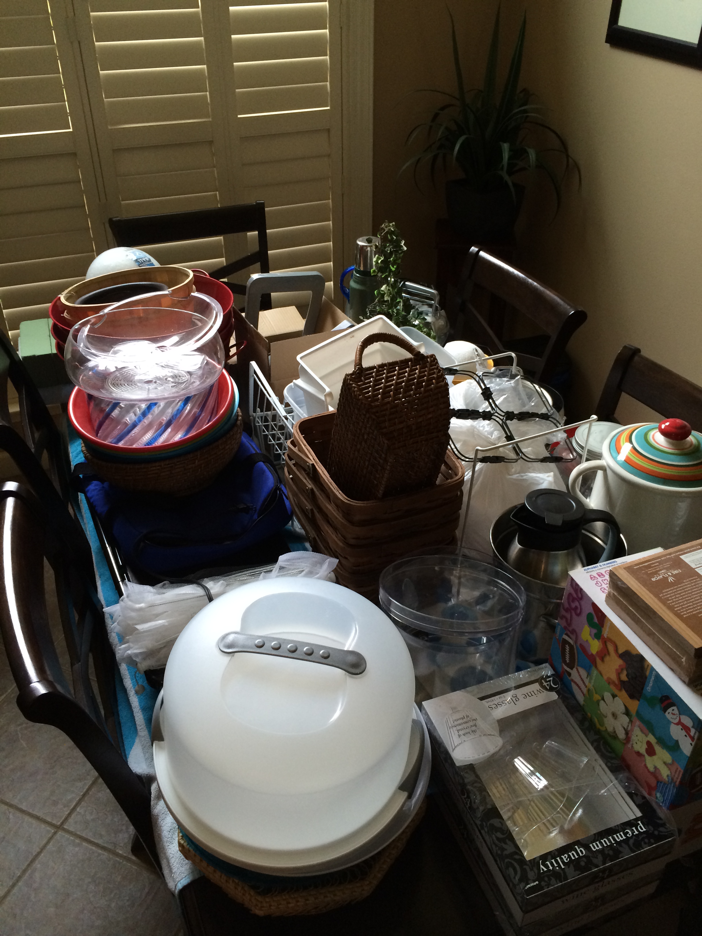 And here’s everything from the storage piece that we got rid of and will be transferring to new shelving, making a lovely home on my dining room table right now: