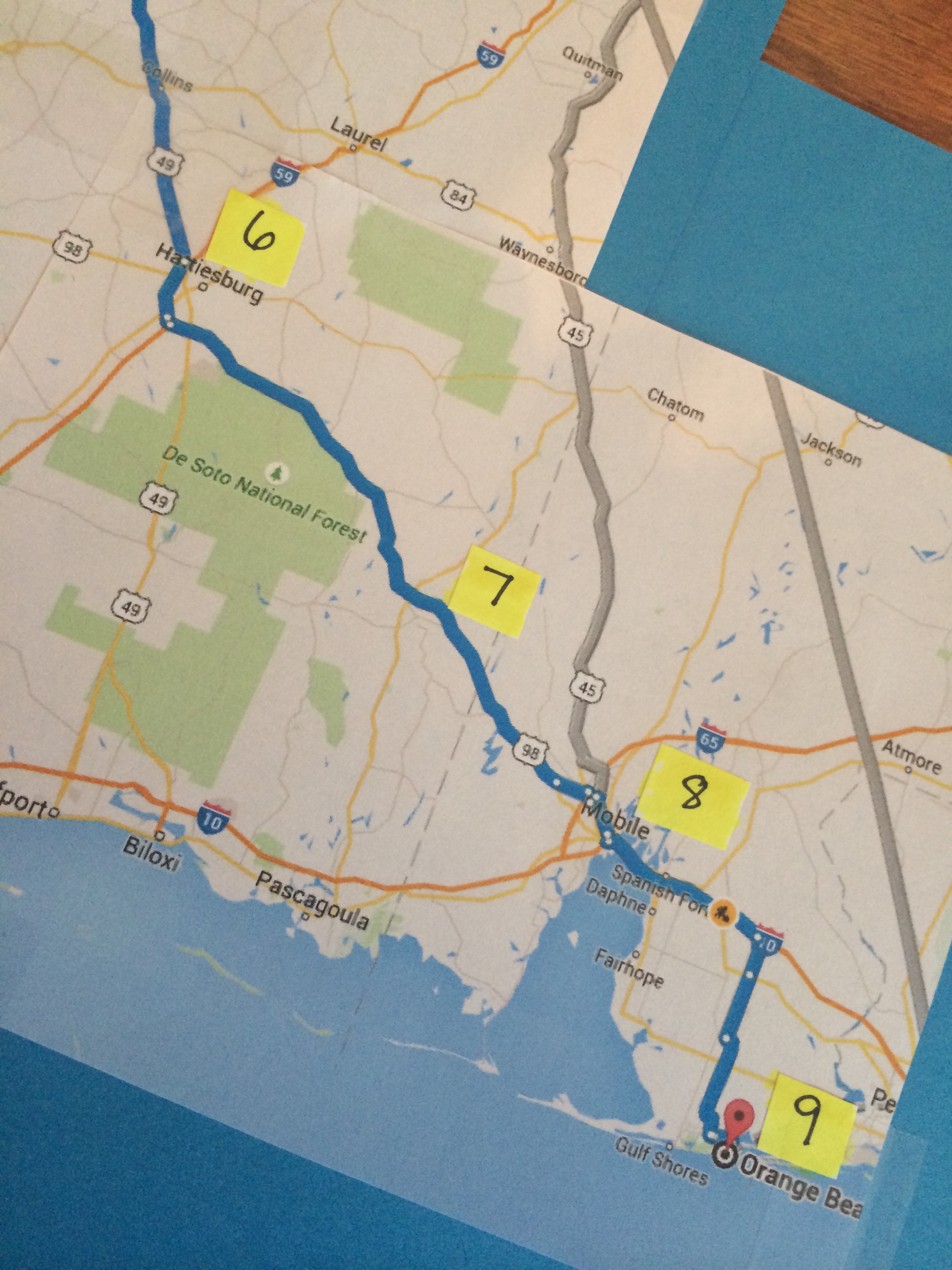 The most dreaded question on a road trip with kids has to be, “ARE WE THERE YET?”  It seems to be uttered for the first time as the garage door closes and continues its shrill, taunting chant before we can even get the first DVD started.  I knew this was coming, especially after our first road trip in the spring with our son that was only about 5 hours seemed to double with his constant insistence that we were almost there in “3 more minutes, right momma?”   So as we approached the much longer drive to the beach vacation this summer I knew I had to find a way to give him a visual for how much longer it would be to our destination.  I did some pinterest searching and quickly found a reasonable project that I could handle in the 24 hours before we left – in fact it took all of 30 minutes!