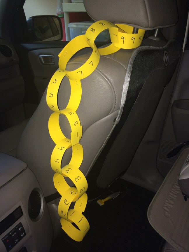 Photo Aug 16, 9 26 04 AMI made a paper chain numbered 1-9 (the number of hours our drive would be) and attached it to the headrest of the passenger’s seat so it was in front of his seat.  Using Google maps I figured out where we’d be after an hour of driving, Photo Aug 16, 9 33 46 AM2 hours of driving, etc. I kept this list with me in the front seat as a reference.  You could easily take that part out of the project and just go by the hours on the clock, but this allowed for stops and rearranging of the schedule without running out of links in the chain.  I also made a 2nd set of links to pack along with the stapler so that I could set up a chain for the ride home.  I did the countdown backward that time (9, 8, 7…) so that he knew when we got to number 1 we were home.  You could also throw in different colored links to indicate the hours or locations when you plan to stop for meals or other scheduled stops.